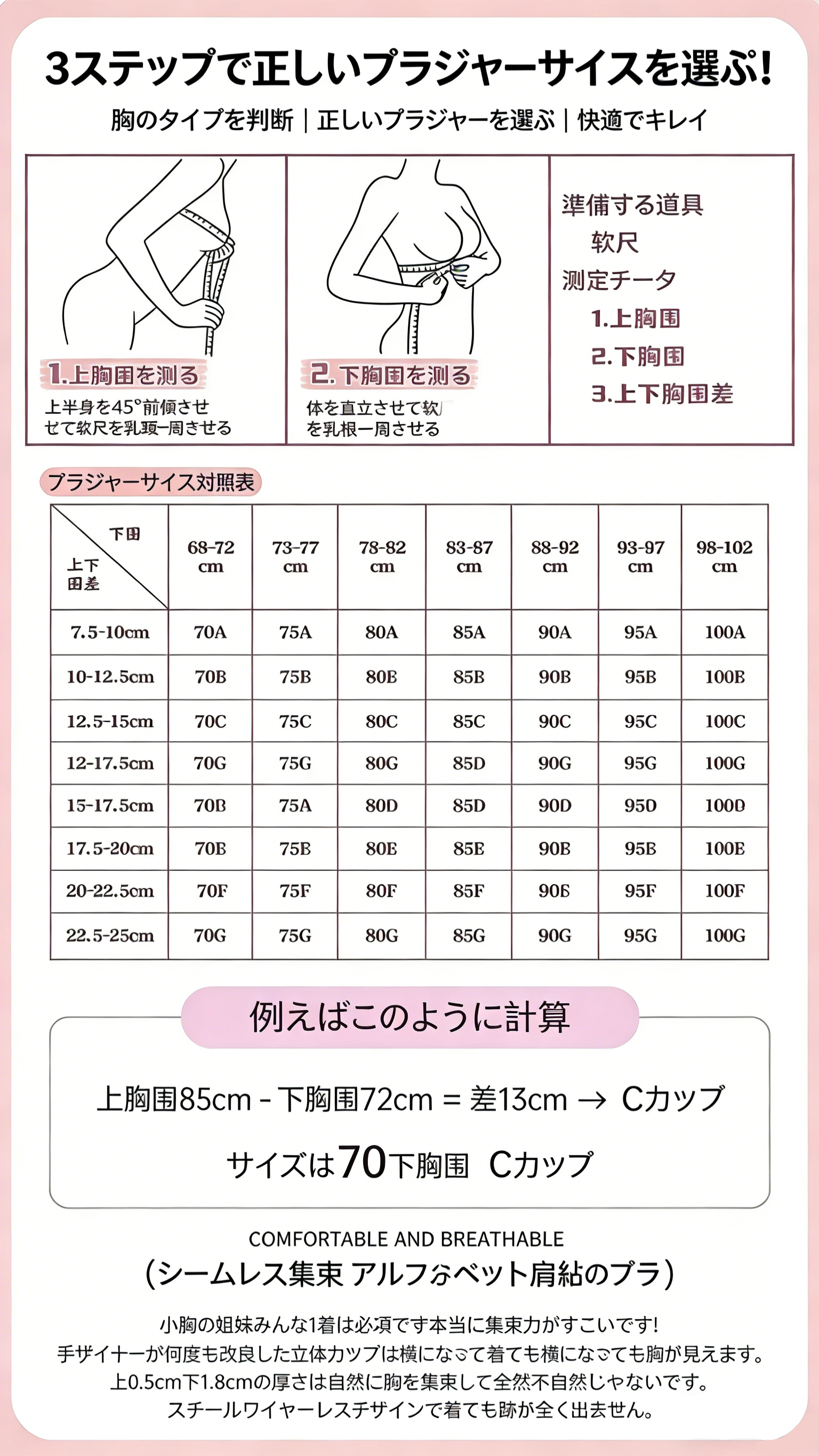 2. バストをふっくらとシェイプアップしたい方には、0.5cm厚タイプがおすすめです。垂れ下がりを防ぎ、リフトアップ効果を高めます。サイズ表をご参照の上、適切なサイズをお選びください。A/Bカップなど小さめのバストの方は、カップ内に隙間が生じる場合がございますので、ご注意ください。